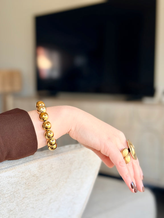 Sublimez votre poignet avec le bracelet Anas, composé de boules en résine dorée qui captent la lumière et apportent une touche chaleureuse et moderne.