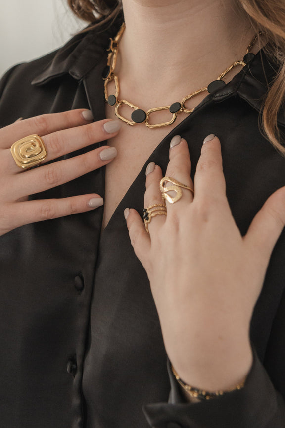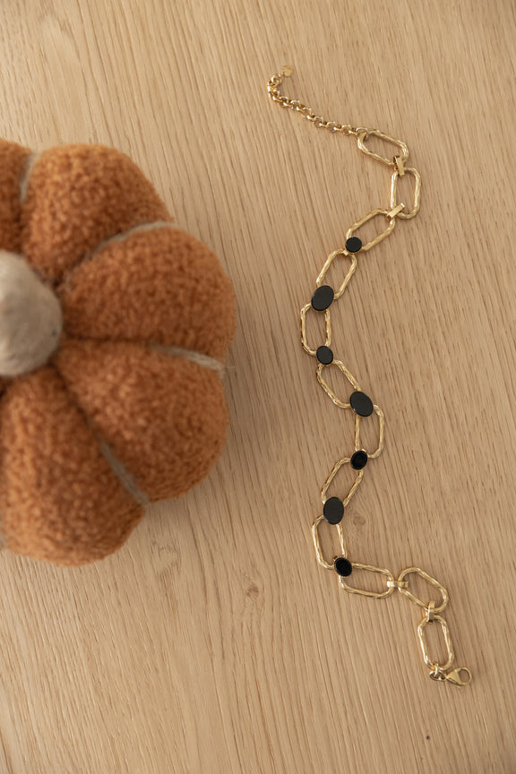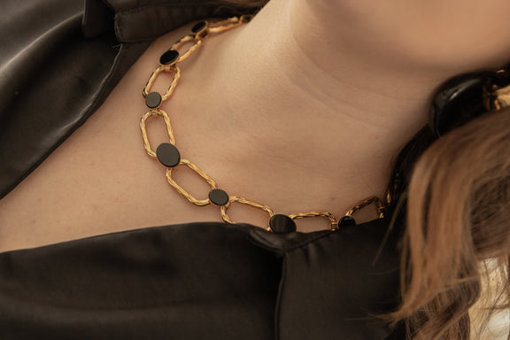 Élégant avec une touche de caractère ✨ Le collier Aziel se compose d’une chaîne à maillons rectangulaires en acier inoxydable, sublimée par de délicates pierres d’Onyx noir. Avec sa longueur de 36 cm + 5 cm d’extension, il se porte près du cou et apporte une allure moderne et affirmée à vos tenues.
