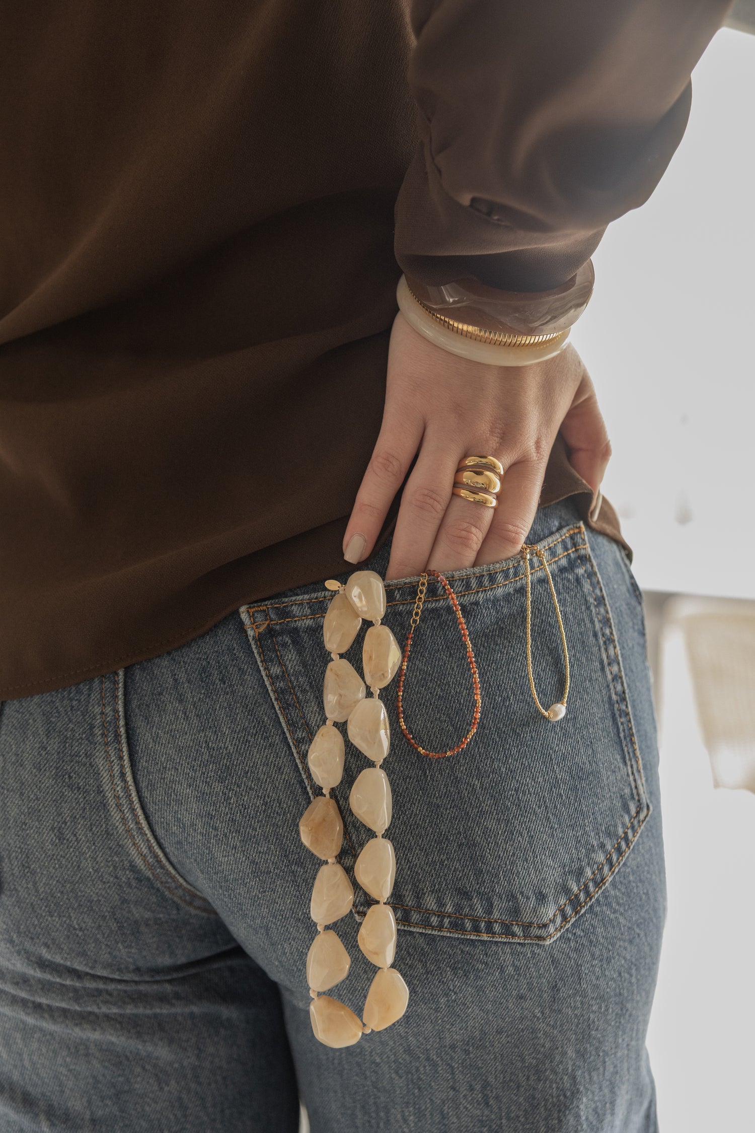 Le collier César se distingue par son audace : une pièce ajourée en résine écru sublimée par l’éclat doré de l’acier inoxydable. Un bijou affirmé qui incarne toute la force et l’élégance de la composition Ambrescence.