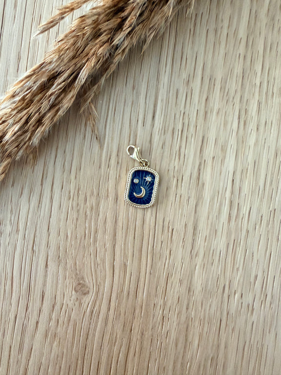 Un charm en acier inoxydable avec un pendentif en forme de plaquette émaillée, décoré d’une lune et de deux étoiles scintillantes grâce à de petits oxydes de zirconium ✨. À clipser et accumuler pour créer un bijou unique qui brille au rythme de tes envies.