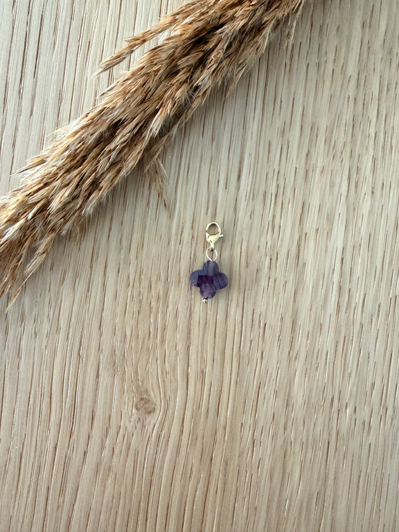 Un charm trèfle en acier inoxydable, orné d’une pierre d'Améthyste taillée en forme de trèfle porte-bonheur. À clipser, accumuler et porter avec amour ✨. Chaque pièce est unique et apporte sa touche de couleur et d’éclat à tes bijoux.