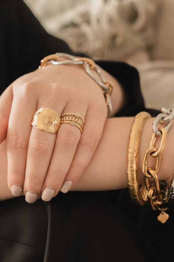 Graphique et élégante, la bague Ezekiel séduit par sa forme striée au design moderne. Conçue en acier inoxydable, elle est ajustable de la taille 50 à 56, ce qui la rend confortable et facile à porter au quotidien. Avec sa hauteur de 19 mm et son anneau de 2,5 mm, elle allie finesse et caractère dans un bijou unique.