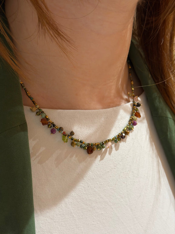 Le collier Lila associe de délicates perles en turquoise africaine à des pampilles ornées de pierres naturelles multicolores, pour un bijou lumineux, féminin et plein de vie. Sa longueur idéale met en valeur le cou et apporte une touche bohème chic à toutes vos tenues.