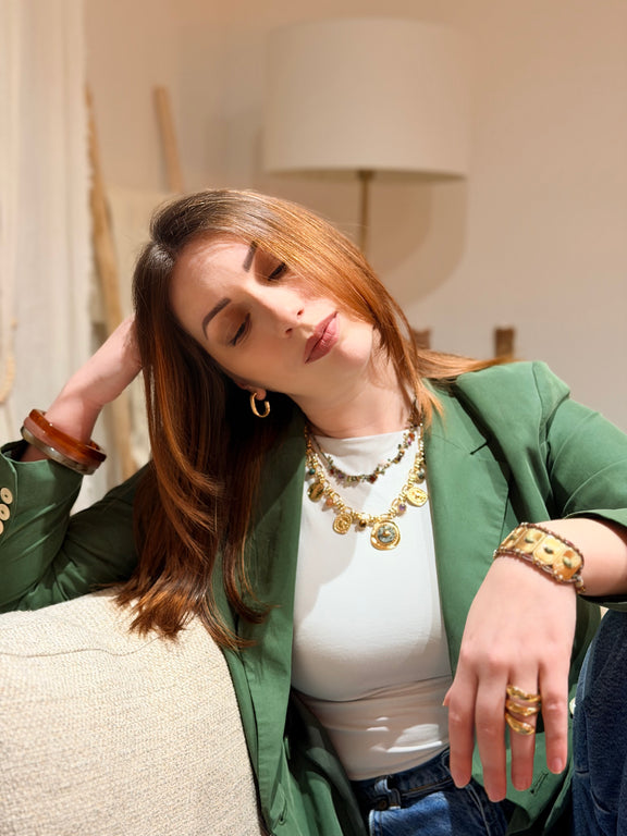 Facile à porter au quotidien, il se suffit à lui-même ou se marie parfaitement avec d’autres colliers pour un look solaire et affirmé.