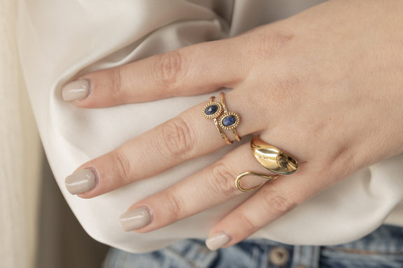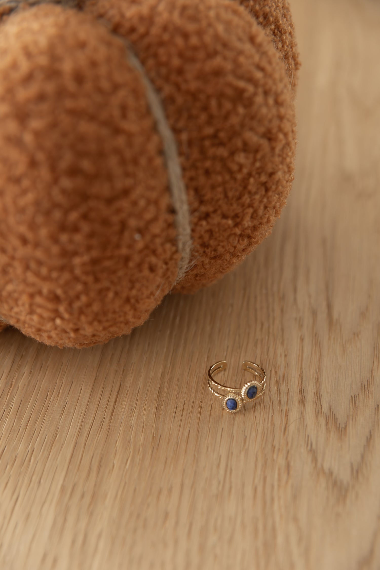 Double anneaux martelés, deux pierres naturelles ovales de Lapis Lazuli et un look qui envoie du style. Nix est une bague moderne et lumineuse, parfaite pour ajouter une touche chic et mystérieuse à vos tenues. Ajustable, elle s’adapte facilement de la taille 52 à 58 pour un confort optimal.