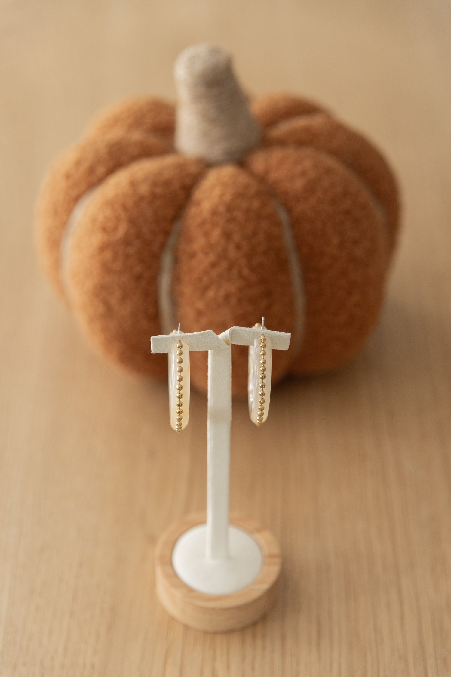 Les créoles Noor captivent par l’alliance subtile de la résine écru et des reflets dorés de l’acier inoxydable. Leur design épuré et lumineux reflète l’élégance intemporelle de la composition Ambrescence.