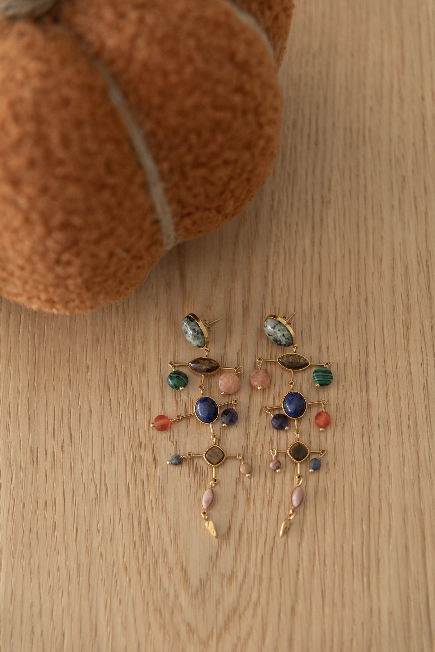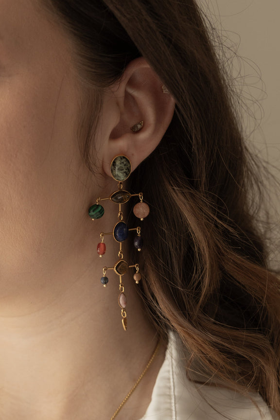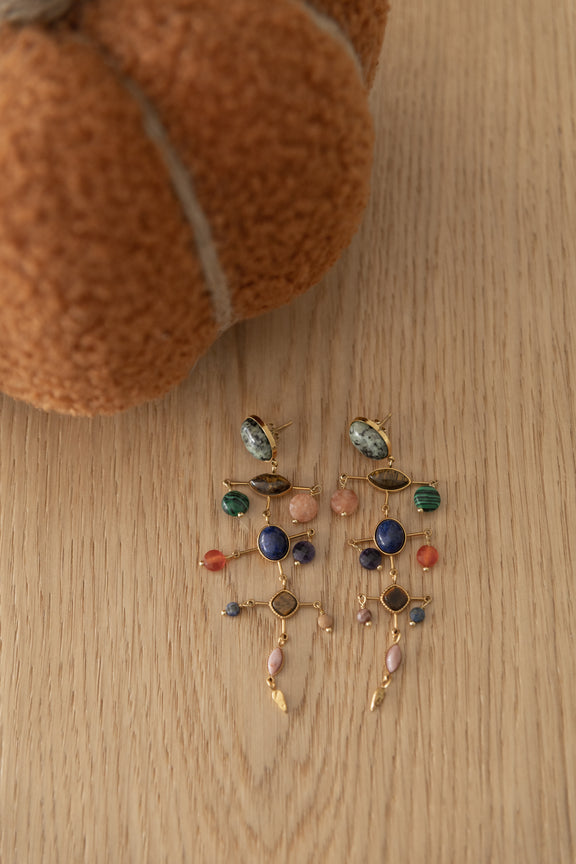 Les boucles Nova associent des pierres ovales multicolores à une structure en acier inoxydable, créant un mouvement élégant à chaque geste. Avec leurs dimensions de 2,9 cm x 9,5 cm, elles apportent de la hauteur et de la lumière à vos tenues, parfaites pour briller au quotidien ou en soirée.