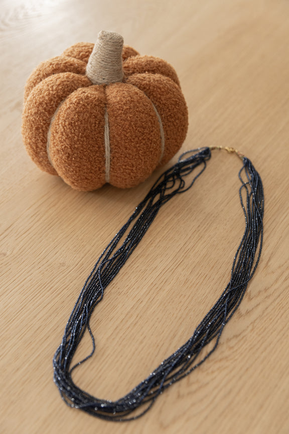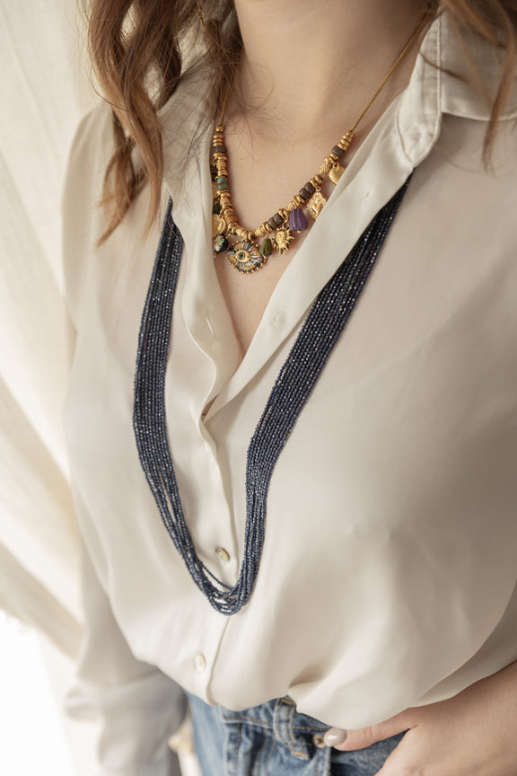 Le sautoir Oriane se compose de 10 rangs de perles de verre bleu marine, créant un effet de volume et de mouvement qui habille le décolleté avec style. Parfait pour apporter une touche lumineuse et sophistiquée à vos tenues, du quotidien aux occasions spéciales.