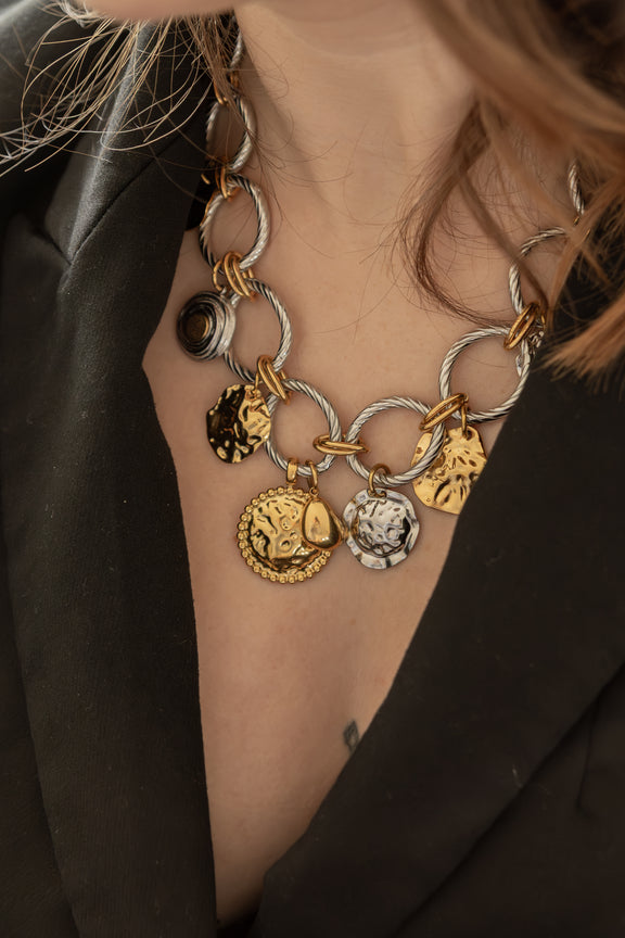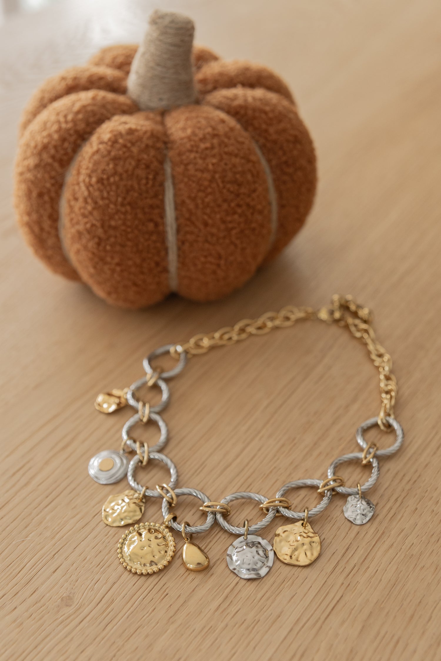 Le collier Oryan associe de gros maillons torsadés argentés à des pampilles sequin bean dorées, pour un mélange de textures et de couleurs ultra tendance. Avec sa longueur de 46 cm + 7 cm d’extension, il s’ajuste facilement et devient la pièce forte de vos looks, du quotidien aux soirées les plus stylées.