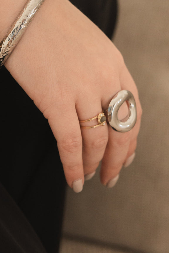 Avec son design travaillé (épaisseur de l’anneau : 7 mm / hauteur de la bague : 9 mm), elle devient la pièce forte de vos looks, à porter seule ou en combinaison avec d’autres bagues.