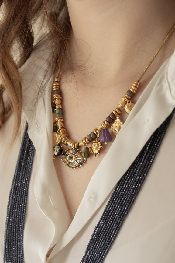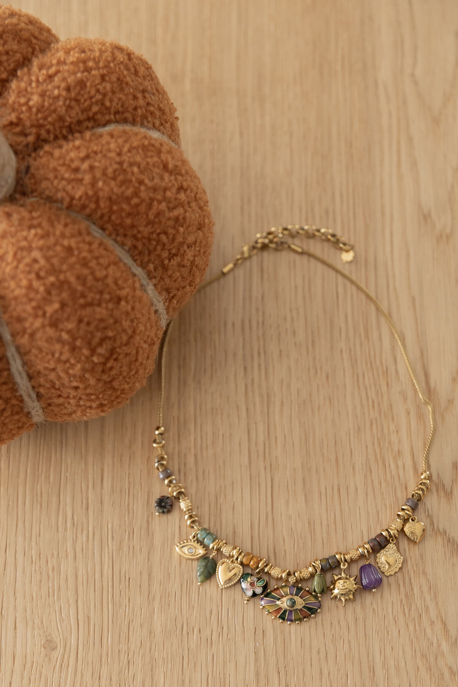 Le collier Vyna associe des rondelles en acier, des pampilles œil et plaque cœur, ainsi que des pierres naturelles et éléments en verre, pour un bijou à la fois moderne et original. Avec une longueur de 42 cm + 7 cm d’extension, il s’ajuste parfaitement et devient la pièce phare de vos looks.