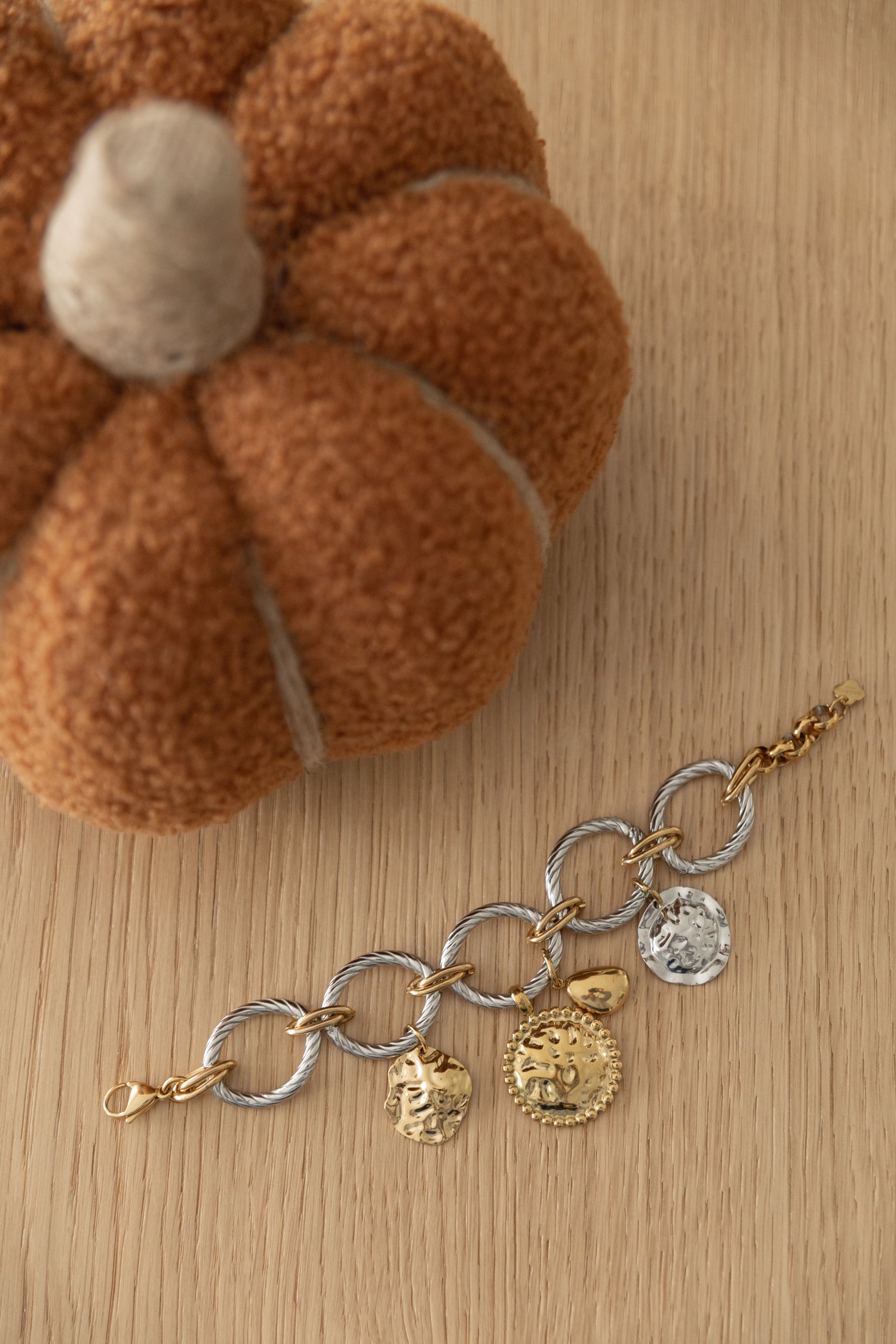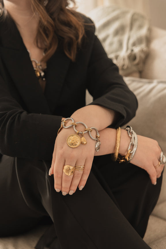 Le bracelet Zayden combine une chaîne à maillons argentés striés avec des breloques cercle dorées qui ajoutent mouvement et éclat à votre poignet. Avec sa longueur de 18 cm + 2 cm d’extension, il s’adapte parfaitement et se porte facilement au quotidien ou pour sublimer vos looks de soirée.